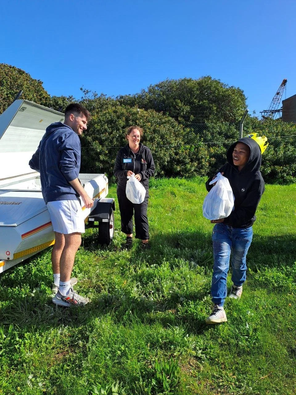 We then thanked God for our food before serving the children a hot meal and enjoying more songs together. This was followed by the distribution of food parcels to each child to take home. We had prepared these the day before in an efficient production line setup, ensuring that every bag had the same content of food, tea bags, vitamins and toiletry items for each family. After goodbyes, the children piled back into the two vehicles and were taken back home to their nearby community in Wolwerivier whilst we tidied up the classroom.