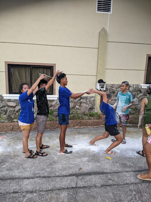 After lunch, we had games for the day, which were themed on "The Amazing Race" and involved completing activities at different stations before rushing off to other ones. The station activities were often quite involved, including such things as making bread dough by passing the ingredients between team members.
